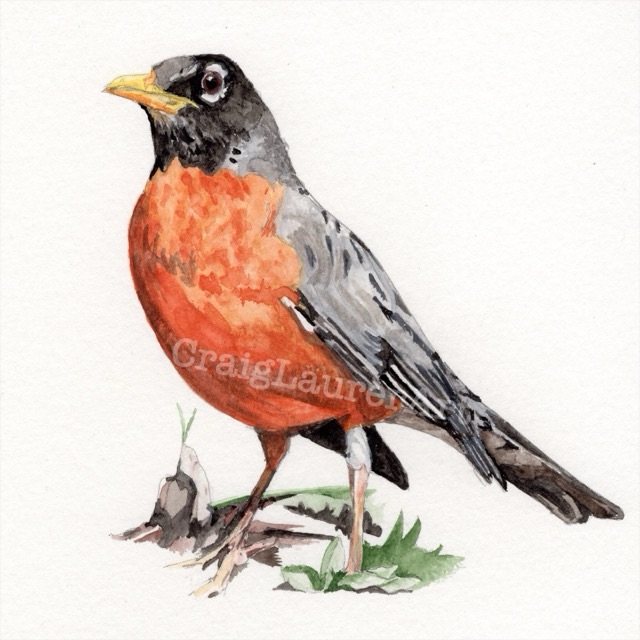 The American Robin is very common around here and this is actually the third time I’ve painted one. I wasn’t completely happy with my other two attempts. I usually see Robins hopping around on the ground looking for food. Traditionally a sign of spring, they seem to be in the Raleigh area pretty much year-round. When they sing, it is surprisingly beautiful.