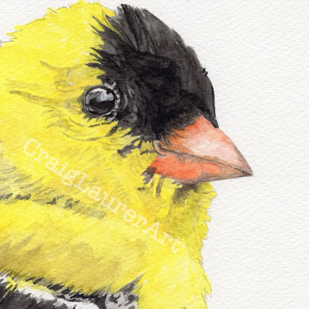 Number 9, and probably last for a while, in my Bird Portraits series is the American Goldfinch. The striking yellow and black finch maintains the beauty of his bright yellow plumage by molting in the spring. Other birds molt only in the fall, only the Goldfinch refreshes his feathers twice a year.