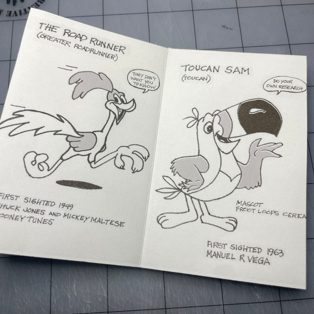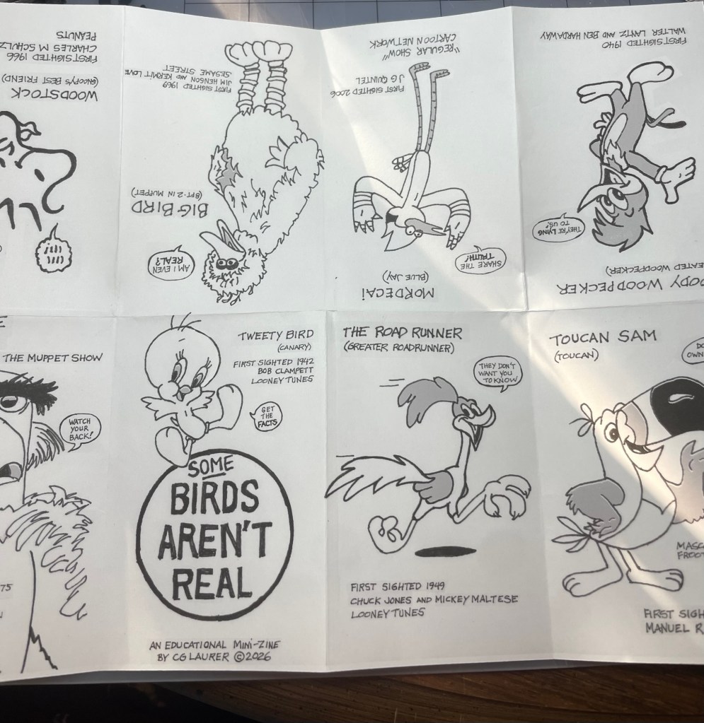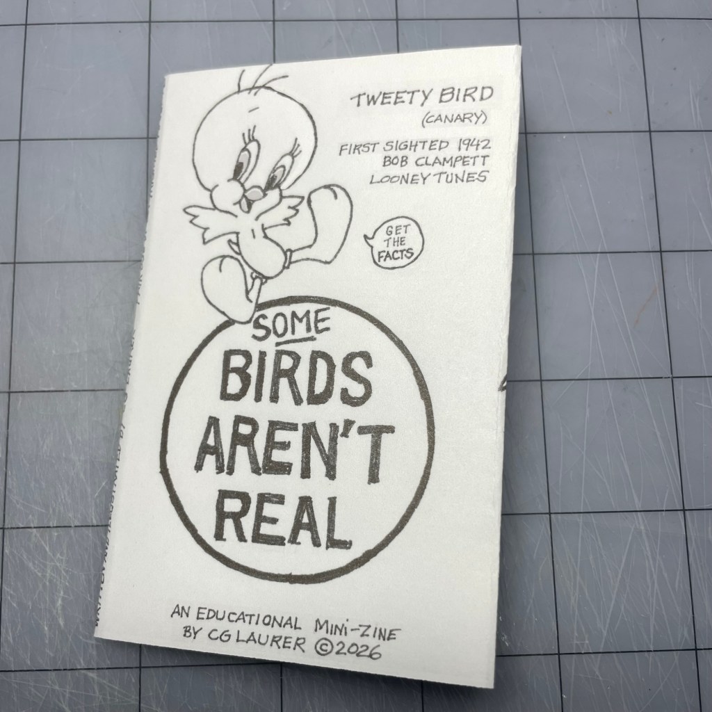 My second mini-zine, “SOME Birds Aren’t Real” is an educational publication meant to help the public navigate the popular conspiracy theory. Get the facts. Featuring 8 birds that I’m pretty sure aren’t real, imparting helpful advice and knowledge to my dear readers. Written and illustrated by me. The character likenesses are mostly copyrighted or trademarked by their respective owners; my interpretation is covered under Fair Use.